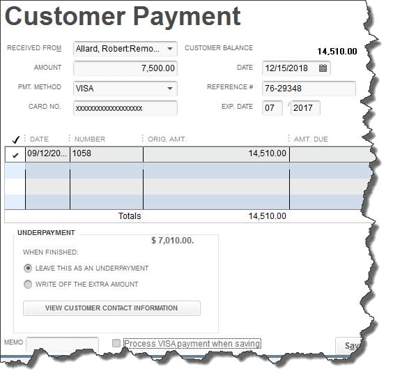 Bookkeeping can be much easier – and funds can move faster – when you accept credit card payments in QuickBooks. But they must be recorded thoroughly and accurately, and you’ll need to make sure that the box in front of Process [VISA, Mastercard, etc.] payment when saving is checked.