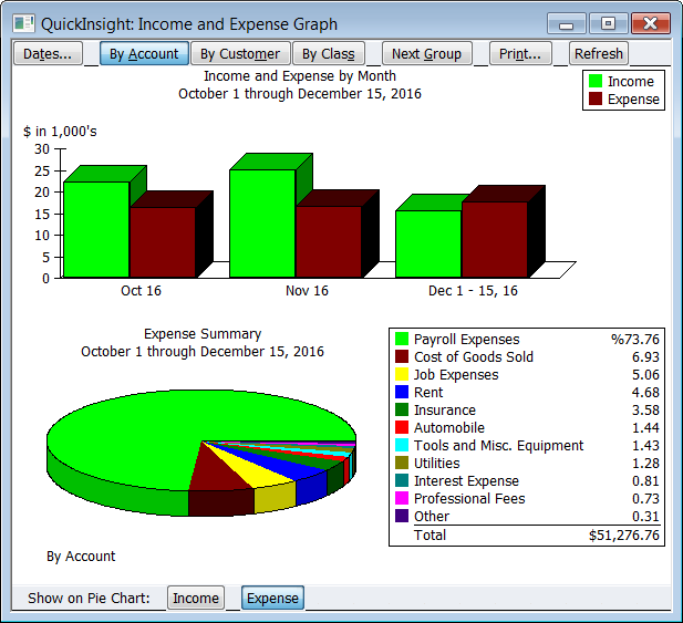 The Income & Expense graph displays your business’s income and expenses for a particular period of time. The bar graph shoes the income and expenses for the period while the pie chart shows a breakdown of income or expenses by account. If you are more of a visual person, viewing your Profit & Loss data in a graph may be more helpful for your business analysis.