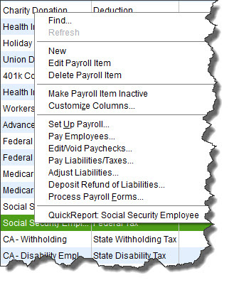 - Use the Payroll Item List. You’ll need to open the Employee Center and Payroll Center for many procedures, but you can also accomplish a great deal from the Payroll Item List window. Seeing this screen regularly also helps you get more familiar with your Chart of Accounts. Open the Lists menu and select Payroll Item List. You can access numerous tasks — like setting up payroll, paying employees and payroll taxes, processing forms, and running reports — by highlighting a payroll account and right-clicking or by opening the menus in the lower left corner of the screen.