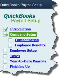 The QuickBooks Payroll Setup tool tells you what information you need to supply in order to start paying employees.