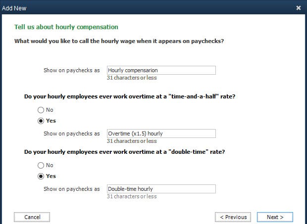 QuickBooks first wants to know about the various types of compensation and employee benefits your company offers. To start adding your Compensation options, click Add New. Click in the box in front of any pay types you support (Salary, Hourly wage, overtime, Commission, etc.) to create a check mark. When you click Next, this window opens:
