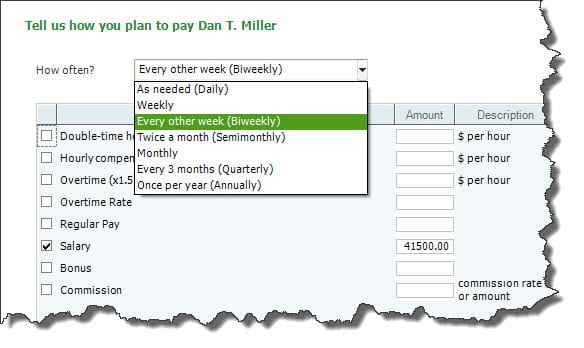 On this screen, you’ll tell QuickBooks what type(s) of compensation and their dollar amounts apply to the employee.