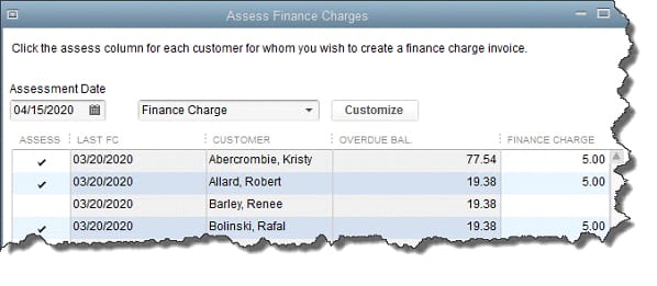 e very sure that the Assessment Date is correct, as it has impact on QuickBooks’ calculations. Being even a day off makes a difference. Select the customers who should have finance charges applied by clicking next to their names in the Assess column. QuickBooks will display the Overdue Balance from the original invoice, as well as the Finance Charge it has calculated.