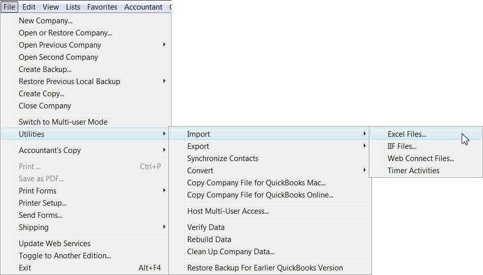 To import from an Excel file, open the File Menu and highlight Utilities. Select Import and Excel Files…