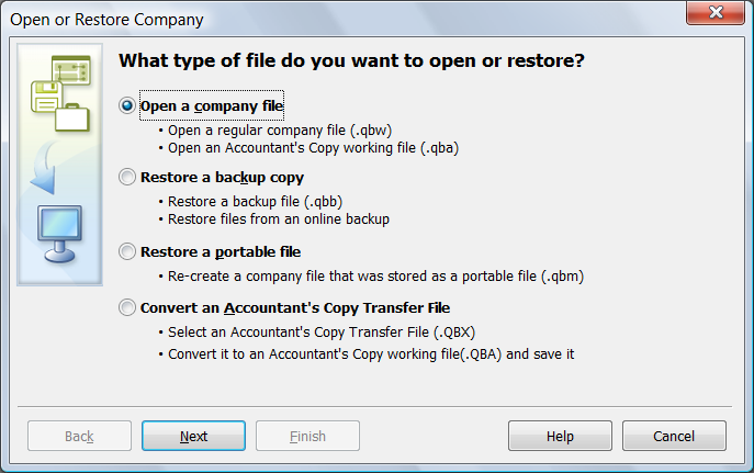 Open the new version of QuickBooks. Click Open or Restore a Company. Select Open a company file and click Next.