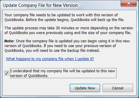 QuickBooks asks you if it can update your file. Select the box stating that you understand that your file will be updated. Click Update Now.