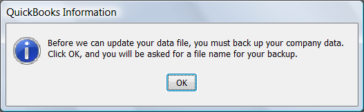 Before updating your data file to the current version, QuickBooks will ask you to back up your file. Once you open this file in the newer version, you cannot open it in the older version. By creating a backup, you will always have access to your data in the older version.