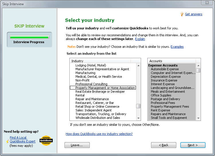 QuickBooks uses this information to create income and expense accounts that will work best for your business.
