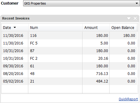 • Open Customer Center and highlight the owner or the property name. On the far right side click on Open Balance to see who still owes their rent. You can also click Customer Snapshot. View recent invoices. Click QuickReport to produce a printable report.