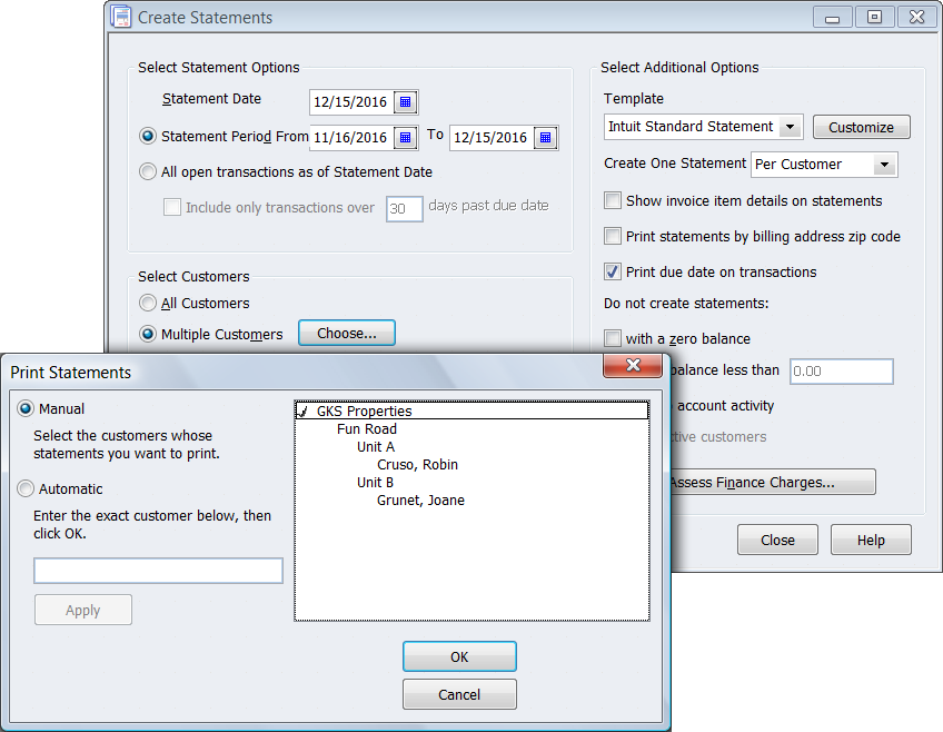 • Create a Statement under Customer Center selecting the owner name