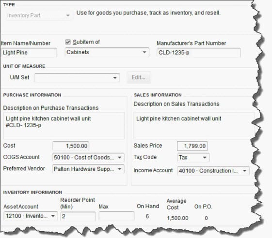 In the example above, the box next to Subitem of has a checkmark in it because “Light Pine” is only one of the cabinet types you sell (you can check this box and select <Add New> if you want to create a new “parent” item on the fly). Leave the next field blank if your item doesn’t have a Part Number, and disregard the UNIT OF MEASURE unless you’re using QuickBooks Premier or above.