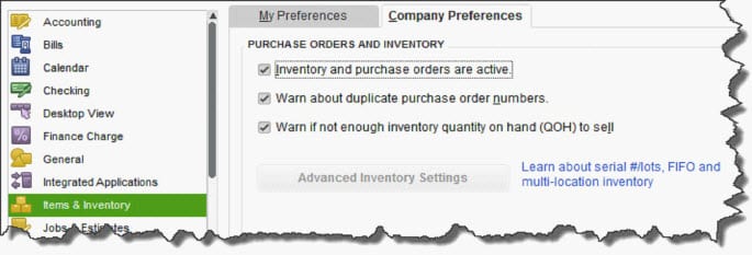 You’ll start this process by making sure that your Records in QuickBooksooks file is set up to track inventory. Open the Edit menu and select Preferences, then Items & Inventory. Click the Company Preferences tab and click in the box in front of Inventory and purchase orders are activated if there isn’t a check in the box already. Here, too, you can ask that QuickBooks warn you when there isn’t enough inventory to sell. Click OK when you’re finished.