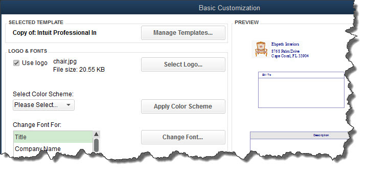 The best, most noticeable thing you can do to customize your invoice is to add a logo. Click the box in front of Use logo, and locate the file in the computer directory that opens. Double-click it. You logo will appear to the left of your company name and address in the upper left corner of the preview.