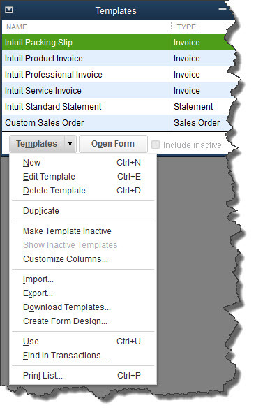 Figure 1: QuickBooks’ Templates window shows you what forms can be customized and provides tools for working with them.