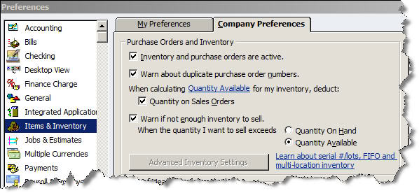 To cut expenses significantly, poke into every corner of your company’s finances. Inventory is a good place to start. If you sell multiple units of the same item and reorder regularly, you should be using QuickBooks’ inventory-tracking tools. Go to Edit | Preferences | Items & Inventory | Company Preferences.