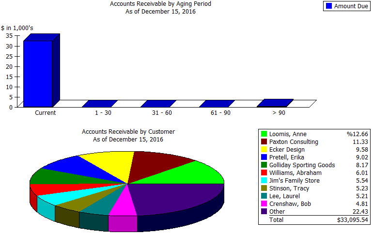 The Accounts Receivable Graph shows how much your Customers owe you as of today, and how much is overdue by aging period. The pie chart shows each Customer and how much they owe relative to other Customer.