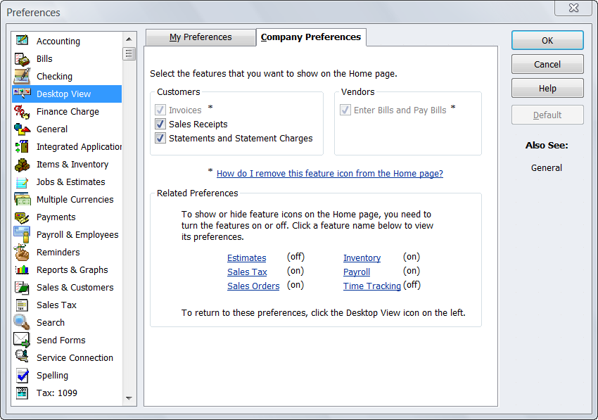 Select the Desktop View and the Company Preferences tab. You can choose which icons you want to appear on the home screen.