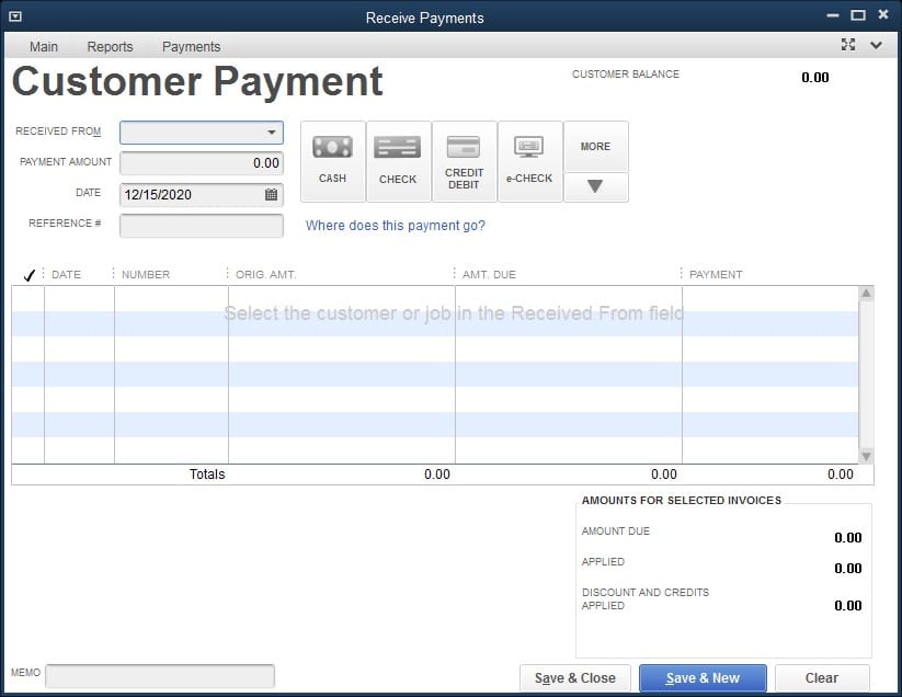 Then, enter the payment received by going to Customers > Receive Payments. Enter all the relevant details. This will mark the invoice as paid.