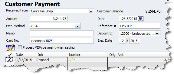 In the Customer Payment window, choose a customer, enter the amount, and select the payment method. Enter the number and expiration date (if this is already in the customer record, it will appear), check the Process xxxx payment when saving box, and save. Upon authorization, the money will go into Undeposited Funds unless you’ve specified otherwise in Preferences.