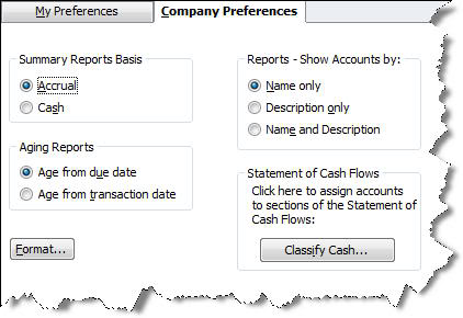 If you want to change this, click Edit | Preferences | Reports & Graphs | Company Preferences and click the desired button: