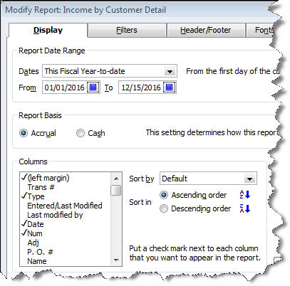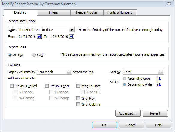 Some of the options here duplicate what you saw in the toolbar. In addition, you can switch between Accrual and Cash for just this report, and add subcolumns in some. The latter is a complicated operation, one that you must understand well in order to glean any insight from it. We can help you with this.
