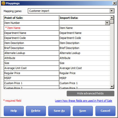 - Custom File. If you already have an Excel file or a comma-delimited text file, you can map its fields to the matching Point of Sale fields.