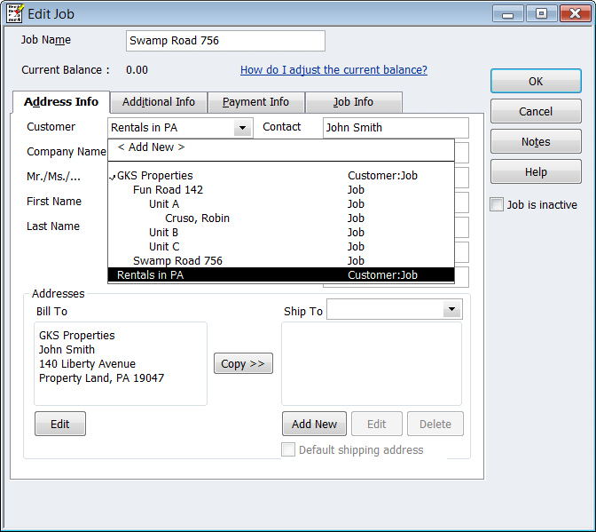 A: First, I would create a new Customer for the new owner. Fill in all of the contact information. Next, edit the Job or the property in question. Change the Customer name from the old customer to the new company we just created. Click OK.