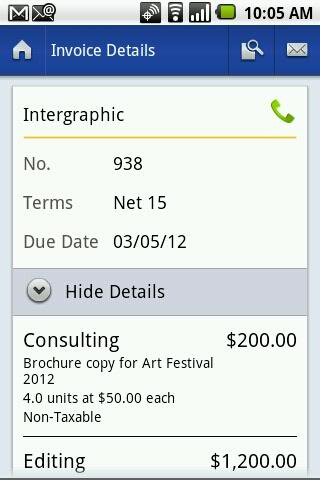 QuickBooks Mobile, shown here on the Android operating system, gives you sales tools when you’re away from desktop QuickBooks.