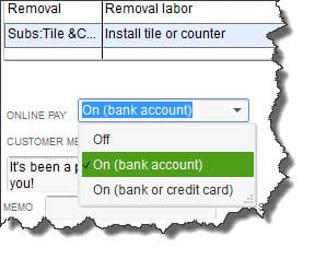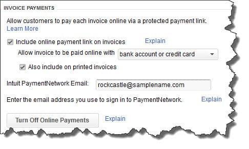 Figure 2: When your QuickBooks Payments account has been activated and you’ve done the setup necessary, you’ll be able to choose what type of payment will be accepted on each invoice.