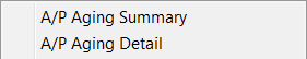 The A/P Aging Detail report lists each bill owed by billing period with the due date and amount due.