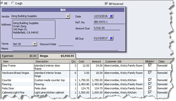 If there’s a matching purchase order, QuickBooks can transfer its information. If not, enter the items on the bill. Check the Billable column and assign it to the correct customer/job so that these items can be easily invoiced.