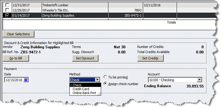 Highlight a vendor and bill to view options. If a discount or credit is available, you can claim it here. Make sure that the payment date and account are correct and specify a payment method.