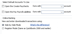 • Register mode will be familiar to users who have used online banking in QuickBooks 2008 and earlier. Register mode is a little more strict about aliases, but if you like the old setup, then choose Checking in QuickBooks option.