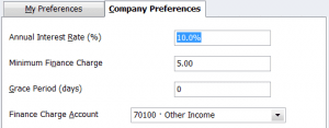 The Finance Charge preferences are a collection of options that have to do with the interest rates and charges that come with customers who are late on their payments. Because this is a company-wide setting, there are no options in the My Preferences tab, only the Company Preferences tab.
