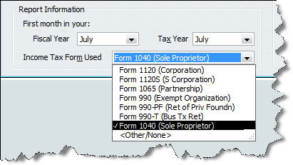Your tax entity setting should have been established when you first set up QuickBooks, but verify that you’ve specified the correct one. Go to Company | Company Information. Your Report Information is in the lower left corner. Click the arrow next to Income Tax Form Used to see what’s active.