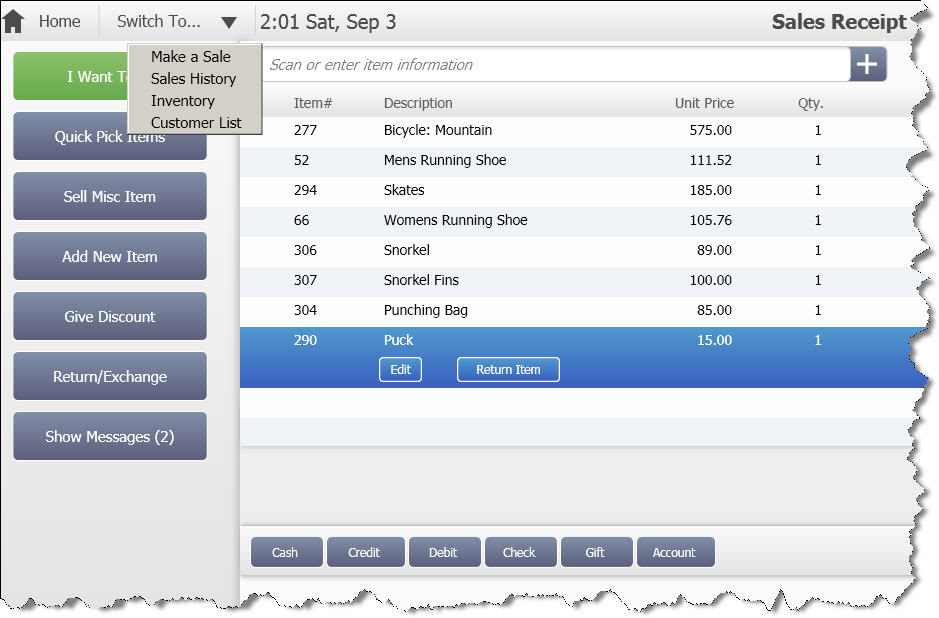 Point of Sale looks and works like other Windows software. To process a sale or return, you simply click tabs, select from lists, and enter data. While you’re entering a transaction, the software is updating inventory and customer information. You can accept six different types of payments — including credit and gift cards — and print receipts.