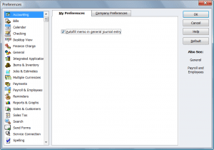 - Clicking this option will automatically attempt to fill in the memo field when making journal entries. This can be a great time-saving tool when entering a large amount of journal entries. While the memo field does auto-populate, it can be changed manually if the wrong data is filled in by QuickBooks.