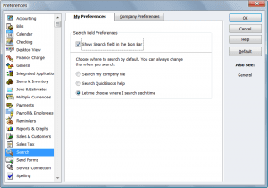 - Located in My Preferences this will display the search field in the top icon bar in QuickBooks