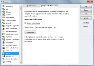 - Located in the Company Preferences tab, you will find a few options concerning QuickBooks search features. From here you can choose to have QuickBooks update the search index automatically, and you can choose how often it updates, so you will have the most up-to-date information available to you.