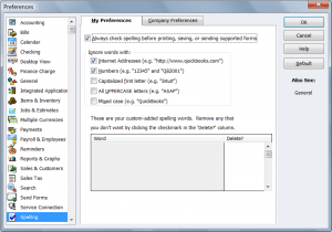 QuickBooks has a great spell-check feature that is very customizable. Since spell-check options are more of a personal preference, the QuickBooks spelling section only has options in the My Preferences tab.