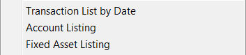 The Fixed Asset Listing report lists all of your fixed assets, the dates that they were purchased, purchase descriptions, and costs. Double-click the entries to view additional details.