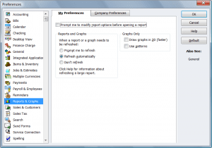 Reports and graphs are a key part of making data significant in QuickBooks.  This section will cover the options that are available in the My Preferences tab for reporting purposes.