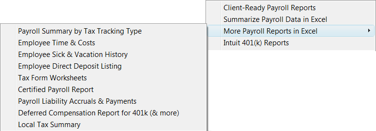 The Client-Ready Payroll Reports are available with a subscription to Intuit QuickBooks Payroll Enhanced for Accountants. These reports give detailed information on payroll activity by employee, payroll expense analysis, and payroll tax reports.