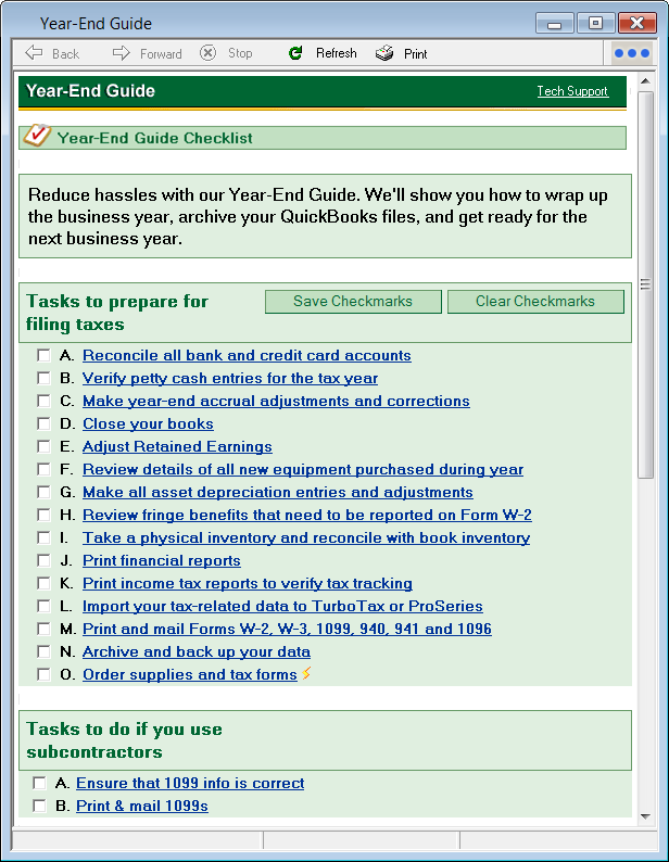 The QuickBooks Year-End Guide is another window I would add to my Favorites menu. Similar to the Alerts Manager, it provides a list of important business tasks that need to be performed at the end of each business year. These tasks will not appear as a reminder but it is always available to you under the Help menu. The Year-End Guide lists tasks related to filing taxes, 1099s, and W-2s. Clicking each link opens QuickBooks Help and provides step-by-step instructions to complete the task. You can also check each task as they are completed.