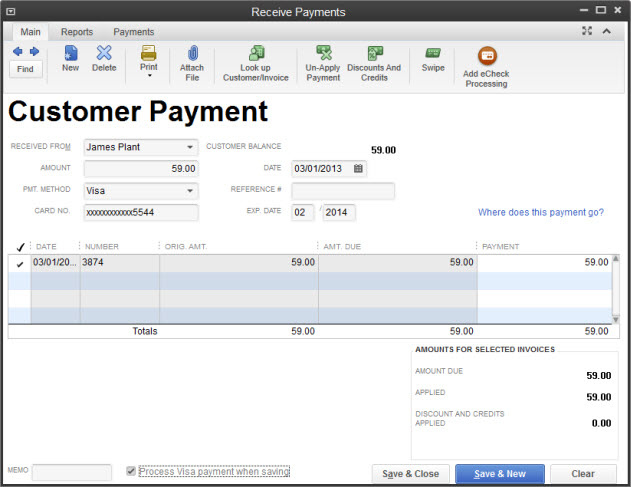 Let’s follow the path of a payment through the desktop version of QuickBooks Premier 2013 (your program screens will look different in earlier versions). Say a customer received an invoice and wants to give you his credit card number over the phone (this is assuming you haven’t set up a payment link within your invoices, or that the customer is uncomfortable entering financial information online). You’d click the Receive Payments icon on the home page to open this screen :