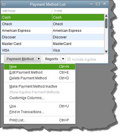 To make changes to this list, click the down arrow to the right of Payment Method. By selecting items from this menu, you can add, edit, and delete payment methods. You can also make one temporarily inactive if for some reason you’re not going to support that option right now but don’t want to delete it, either. Click in the box next to Include Inactive if you want it to remain on the list (an X will appear next to it). When you want to reinstate it, open the Payment Method menu again and select Make Payment Method Active.