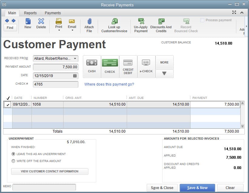 If the payment amount equals the total of all outstanding invoices, there will be a check mark in the first column of every line in the table. If the payment is for any less than the CUSTOMER BALANCE in the upper right, QuickBooks automatically pays the oldest invoice(s) first. You’ll also see an UNDERPAYMENT box in the lower left corner. Click the button in front of your preference here (leave as underpayment or write off the extra).