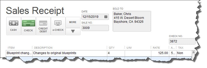 You’ll also use the Receive Payments window to record down payments and overpayments. And there are situations where you’ll have to complete other forms to document the incoming money. For example, if a customer makes a partial payment for products or services that haven’t yet been invoiced, you’d use a Payment Item. A customer who pays for a product at the time it is received would get a Sales Receipt.