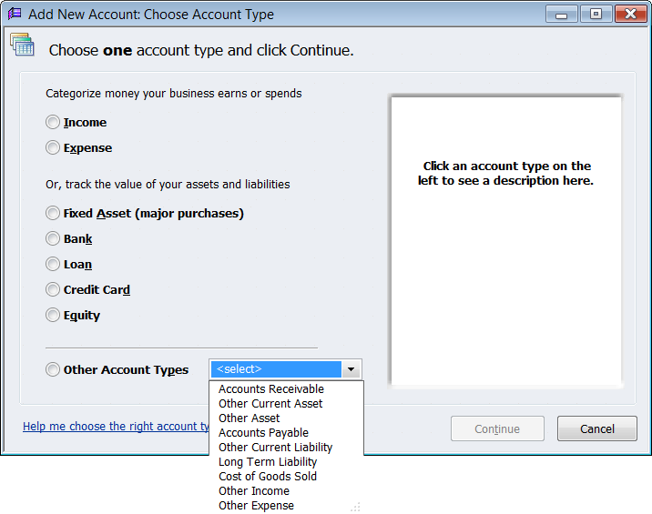 A window like the one above should appear. From there, choose the appropriate account type and follow the steps to add it to your chart of accounts. Easy as pie!