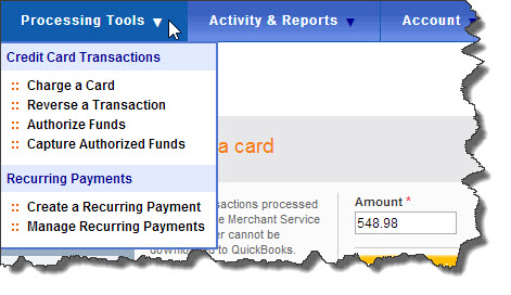 Through the Merchant Service Center. An Intuit Merchant Services account includes access to the Intuit Merchant Service Center, where you can charge a card directly. You can process numerous types of transactions here and run reports, but some of these activities – like reversing transactions – are complex and can create problems if they’re not done exactly right. Talk to us before attempting to do anything beyond charging a card here. And there are better, easier ways to perform that simple activity.